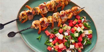 Looking for some BBQ inspiration? Check out this Gluten-Free Butterflied Prawn Skewers recipe with a Feta, Mint & Watermelon Salad.